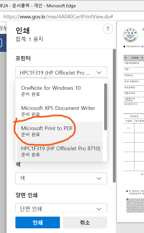 인쇄를 누른 뒤 주민등록등본 파일을 PDF파일로 바꿔줄꺼에요.